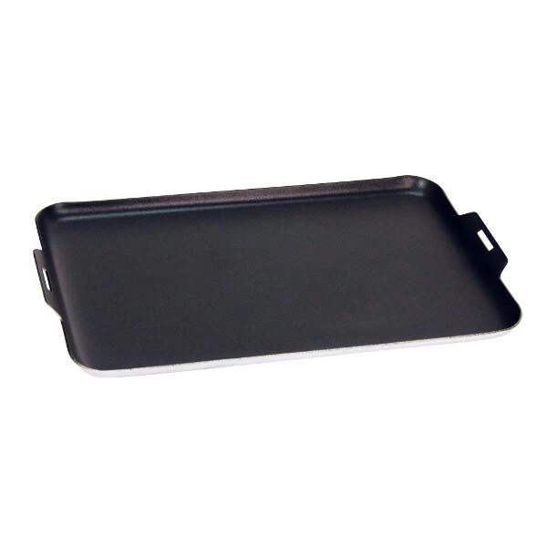 This non-stick aluminum griddle features a non-stick surface that is easy to clean.