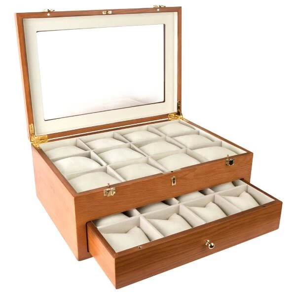 Our oak veneer watch box is an elegant, fragrant way to store up to two dozen time pieces. The top is inlaid with glass for an elegant display and a drawer features 12 slots that double the storage capacity.