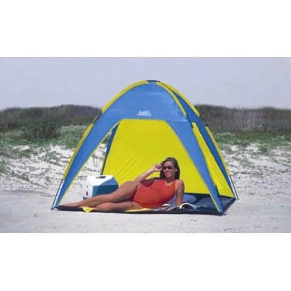The Sun & Wind Cabana features a heavy-duty polyurethane coated taffeta shell and a durable polyethylene floor. The cabana is supported by a two-pole pin and ring frame system with shock-corded fiberglass poles. This cabana is flame retardant and meets C.P.A.I.-84 specifications. Stakes and storage bag included.